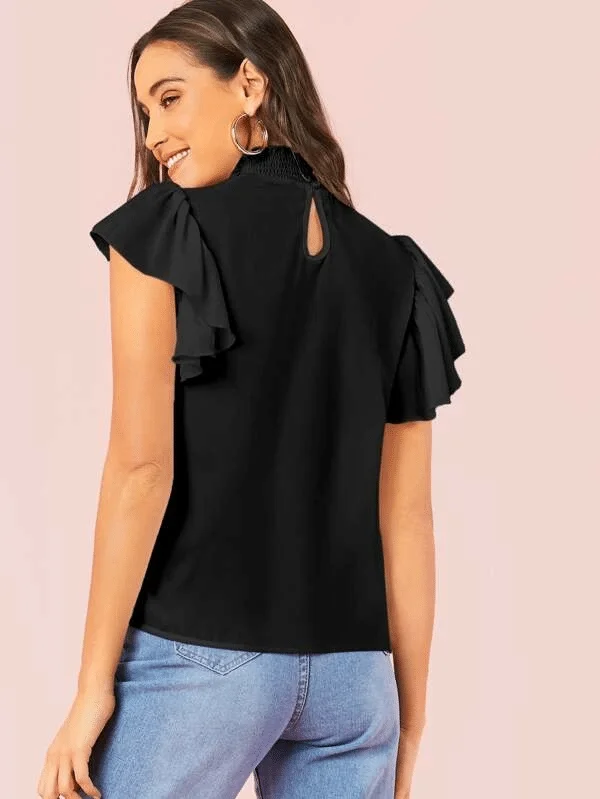 Perfeita para combinar com saias, calças skinny ou jeans, a Blusa Preta com Mangas Bufantes e Gola Média é uma peça curinga e elegante no guarda-roupa feminino.